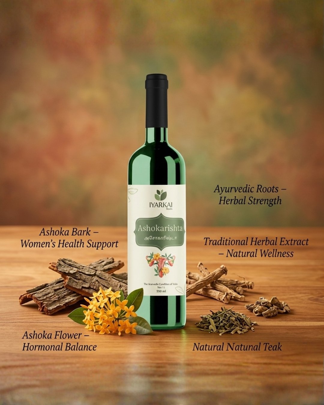 Iyarkai Roots Ashokarishta is a traditional Ayurvedic tonic enriched with Saraca Asoca (Asoka bark) to support women’s reproductive health. It helps regulate heavy menstrual bleeding, relieve cramps, and reduce fatigue, promoting overall balance and vitality. A 100% natural, long-lasting solution for menstrual wellness.