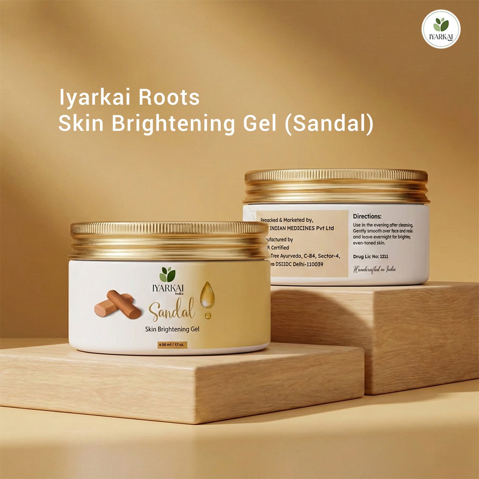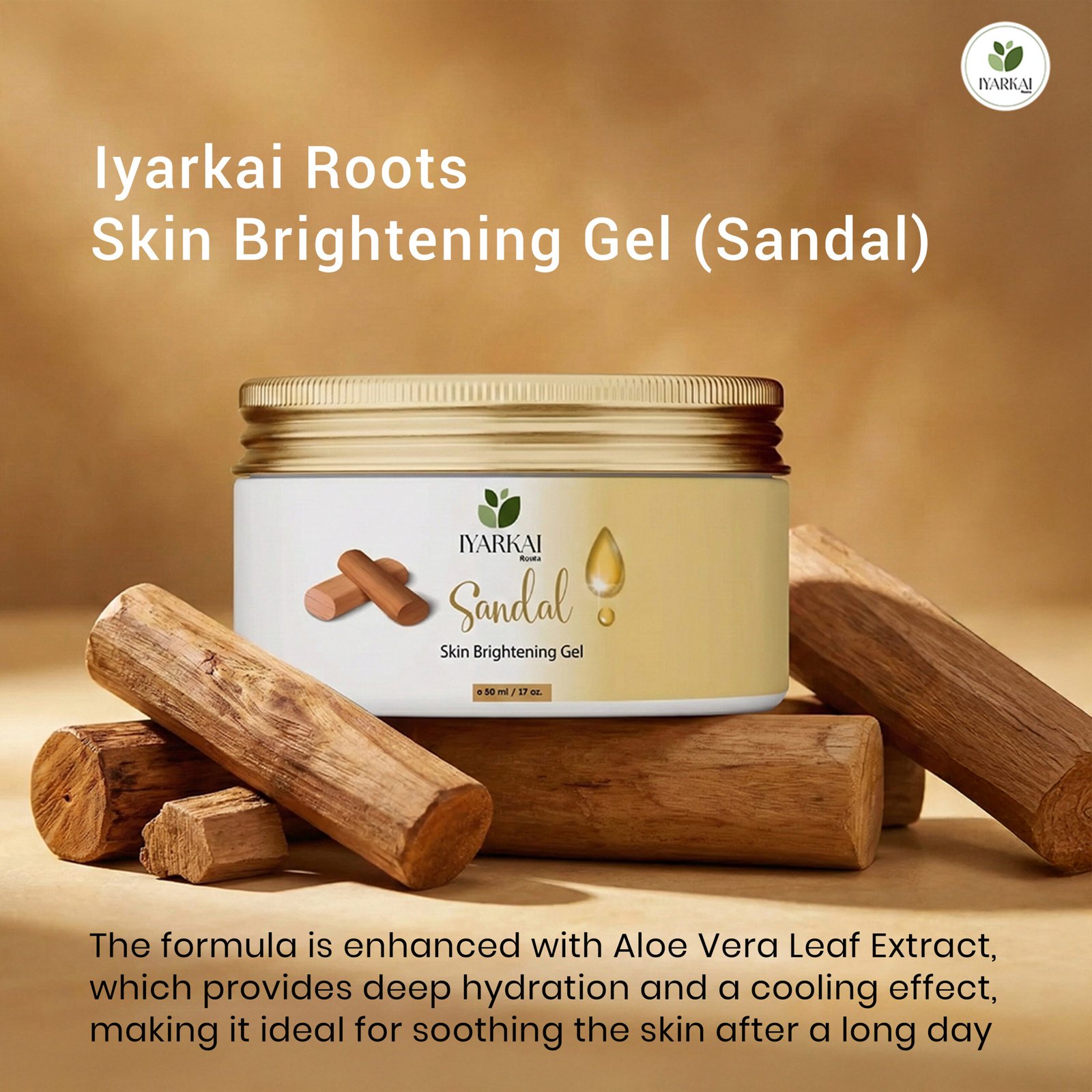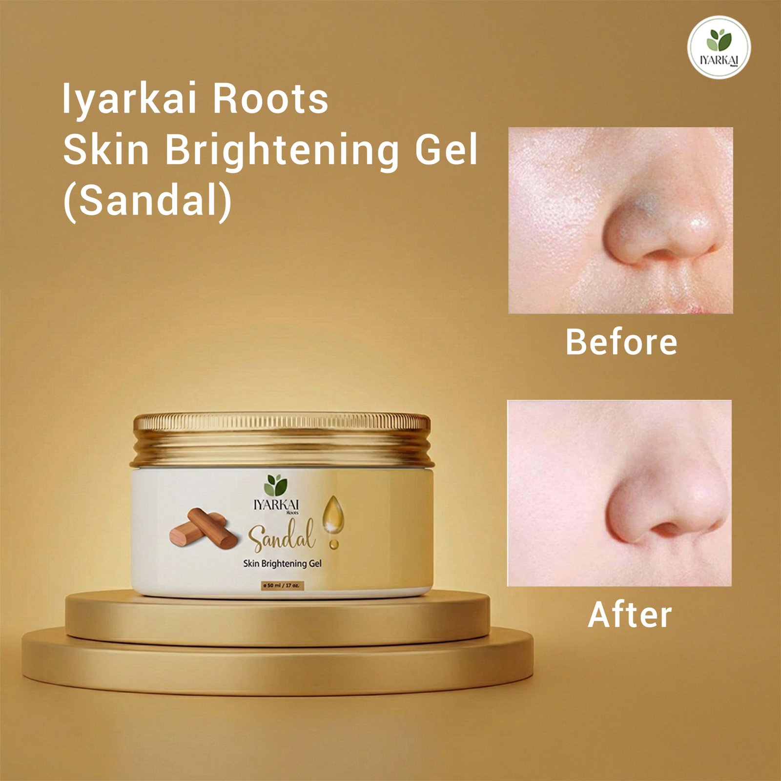 Iyarkai Roots Skin Brightening Gel (Sandal) combines the brightening power of Sandalwood Oil with the soothing properties of Aloe Vera. Enriched with Vitamin E, this handcrafted overnight gel hydrates and revitalizes the skin for a glowing, even complexion.