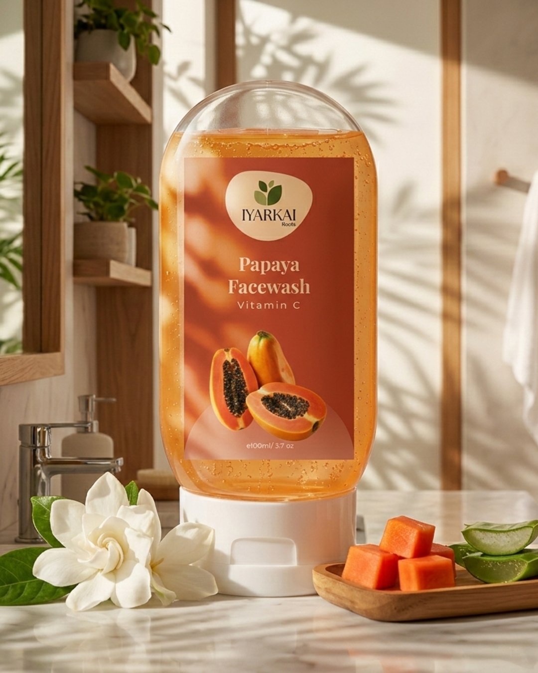 Iyarkai Roots Papaya Vit C Facewash is a gentle herbal cleanser enriched with Papaya Extract, Vitamin C, Organic Aloe Vera, and Viatanza Almond. It effectively removes impurities, fights bacteria, and promotes clear, hydrated, and radiant skin. Ideal for daily use to refresh and brighten your complexion naturally.