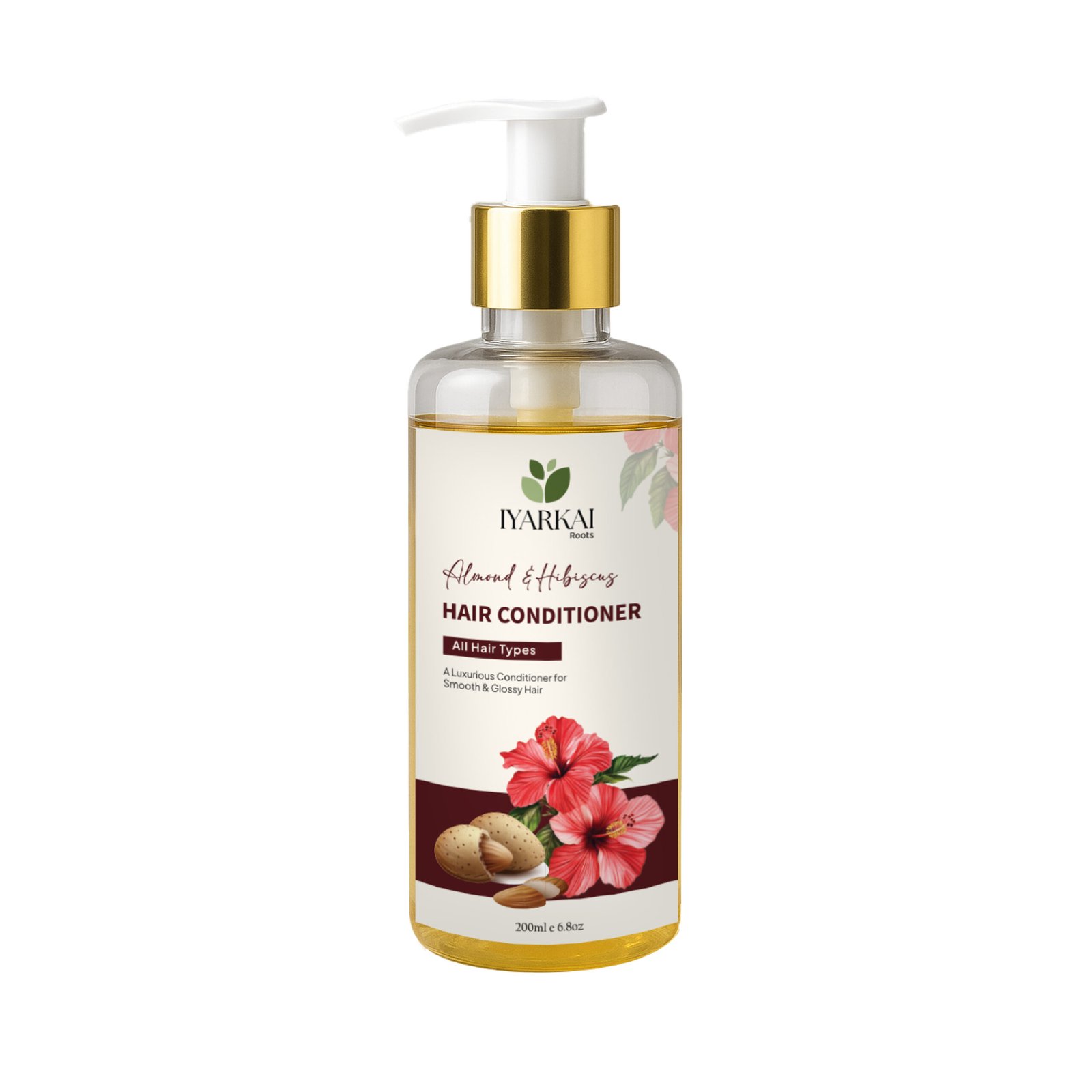 Iyarkai Roots Almond & Hibiscus Hair Conditioner is a herbal conditioner enriched with Almond, Hibiscus, Amla, Onion, Plant Keratin, Vitamin E, and Pro-Vitamin B5. It deeply hydrates, detangles, and strengthens hair while restoring shine and smoothness, offering a chemical-free, nourishing solution for all hair types.