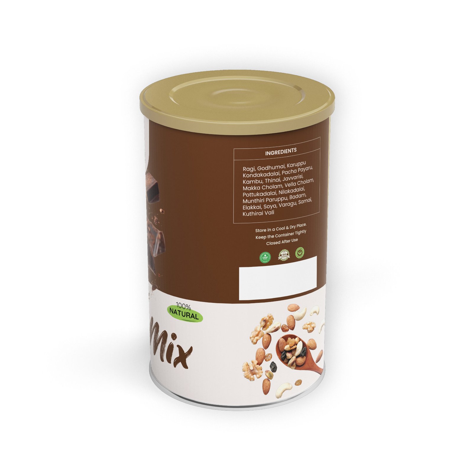 This "100% Natural" formula is a powerhouse of energy, packed with a diverse variety of millets, pulses, and nuts. It features essential grains like Ragi, Wheat (Godhumai), and Kambu, combined with protein-rich ingredients like Almonds (Badam), Cashews (Munthiri Paruppu), and Soya. Perfect for a quick breakfast or an evening snack, this instant mix offers a balanced, convenient way to fuel your body with nature's best ingredients.