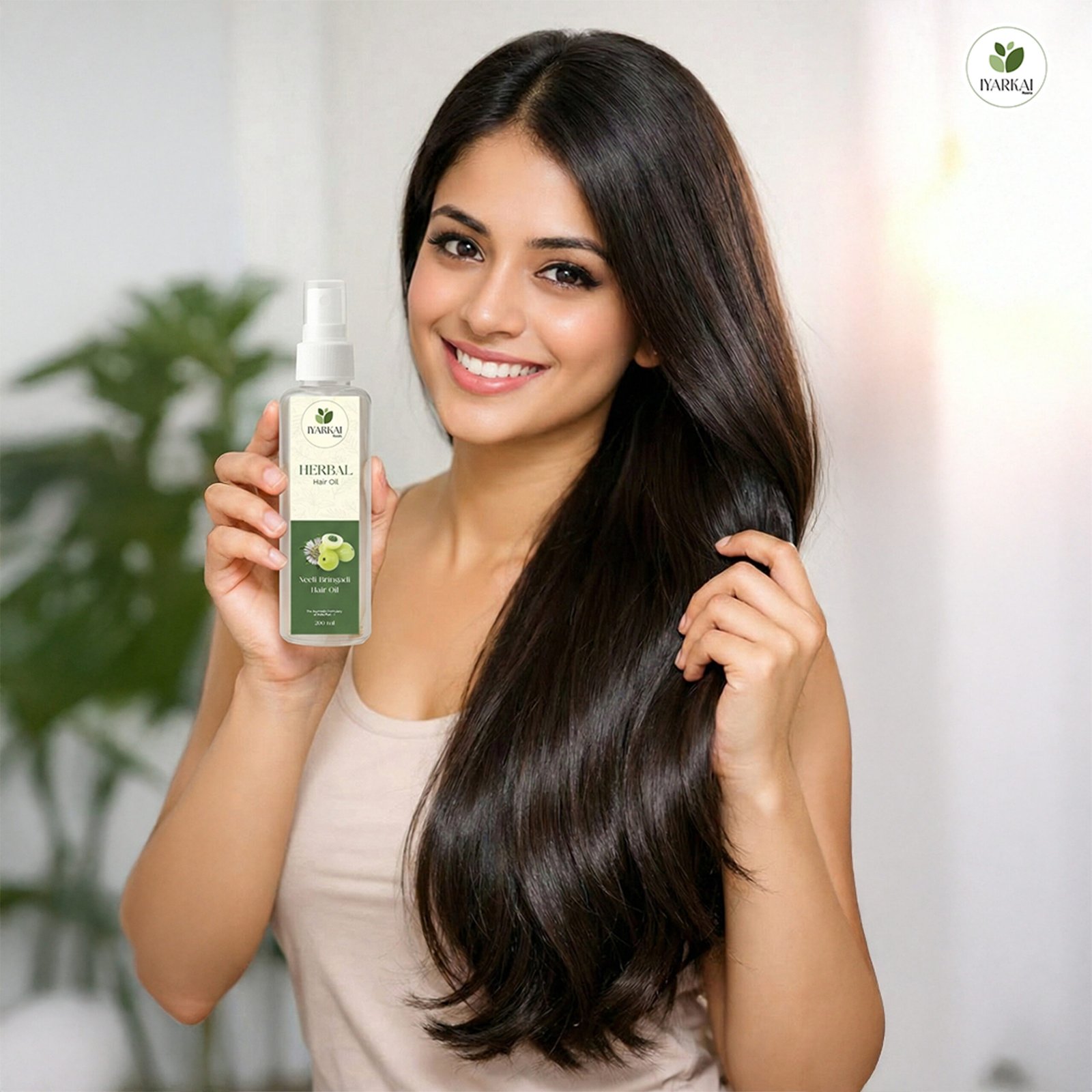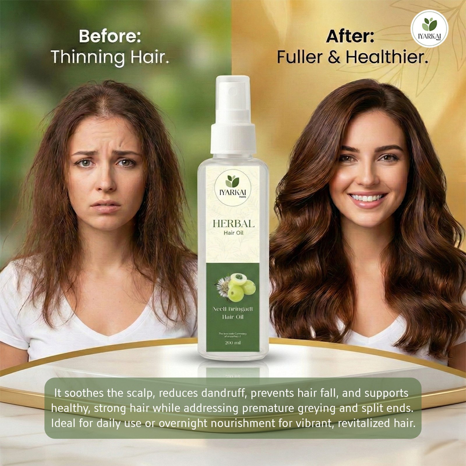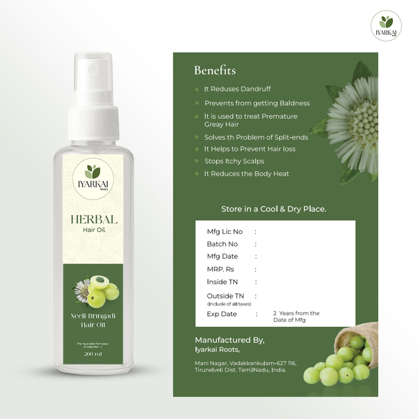 Iyarkai Roots Neeli Bringadi Hair Oil is a classic Ayurvedic hair treatment enriched with Bhringraj and Neeli herbs. It soothes the scalp, reduces dandruff, prevents hair fall, and supports healthy, strong hair while addressing premature greying and split ends. Ideal for daily use or overnight nourishment for vibrant, revitalized hair.