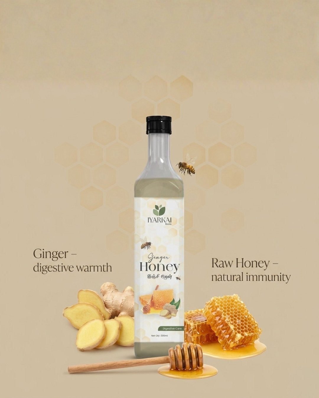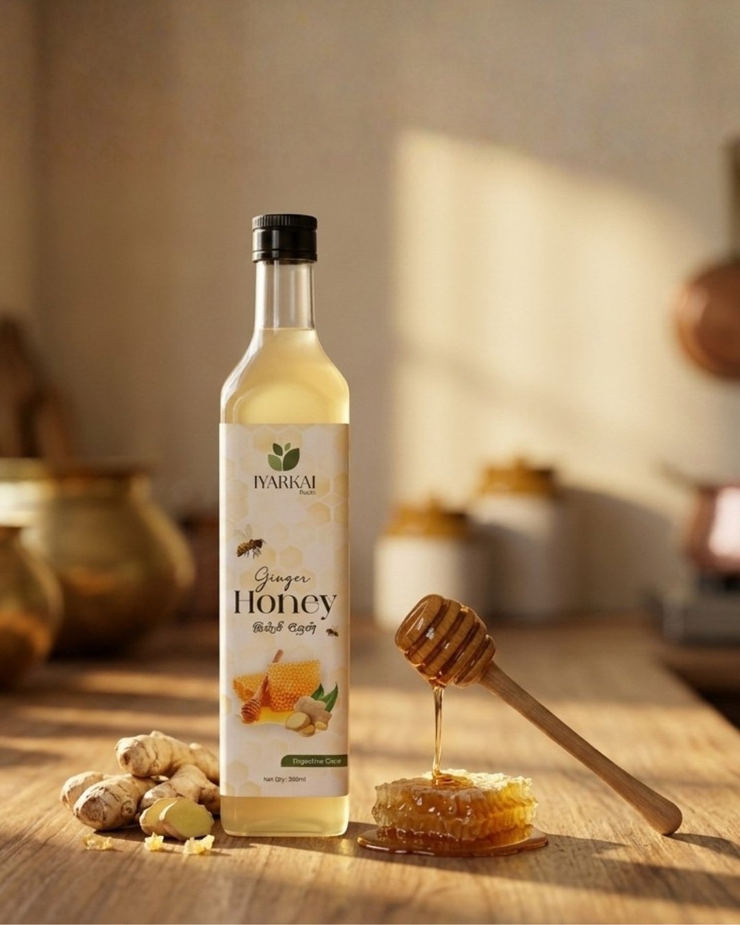 Iyarkai Roots Ginger Honey is a premium, 100% natural nutraceutical blend of Honey, Ginger, Garlic, Lemon, Apple, and Cider Vinegar. Designed to support digestive wellness, it offers a wholesome, sugar-free, and preservative-free way to promote a healthy digestive routine naturally.